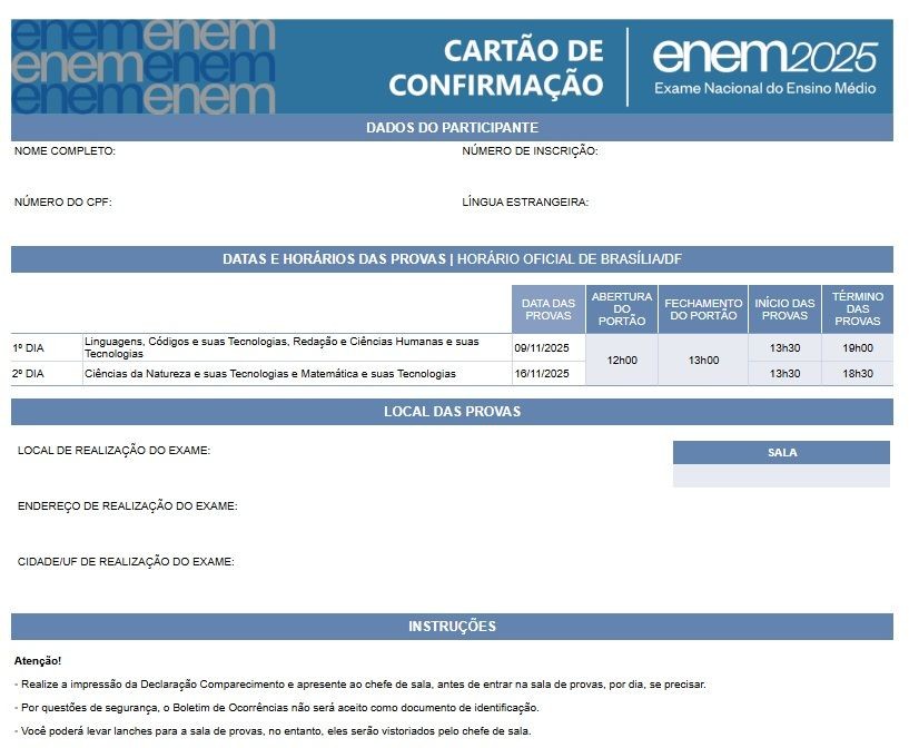 Apesar de não ser obrigatório, o Inep recomenda levar o Cartão nos dias de exame (9 e 16 de novembro). O documento informa o número de inscrição, as datas e os horários das provas, além de indicar se o(a) inscrito(a) tem direito a atendimento especializado ou ao uso do nome social, quando for o caso.