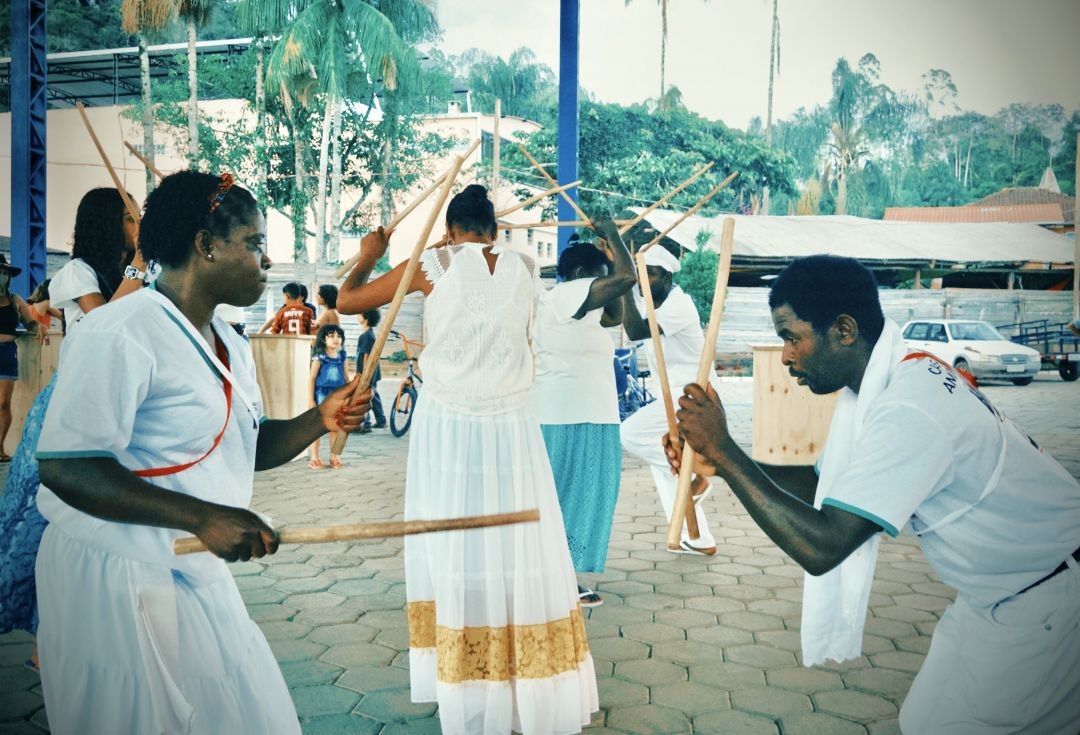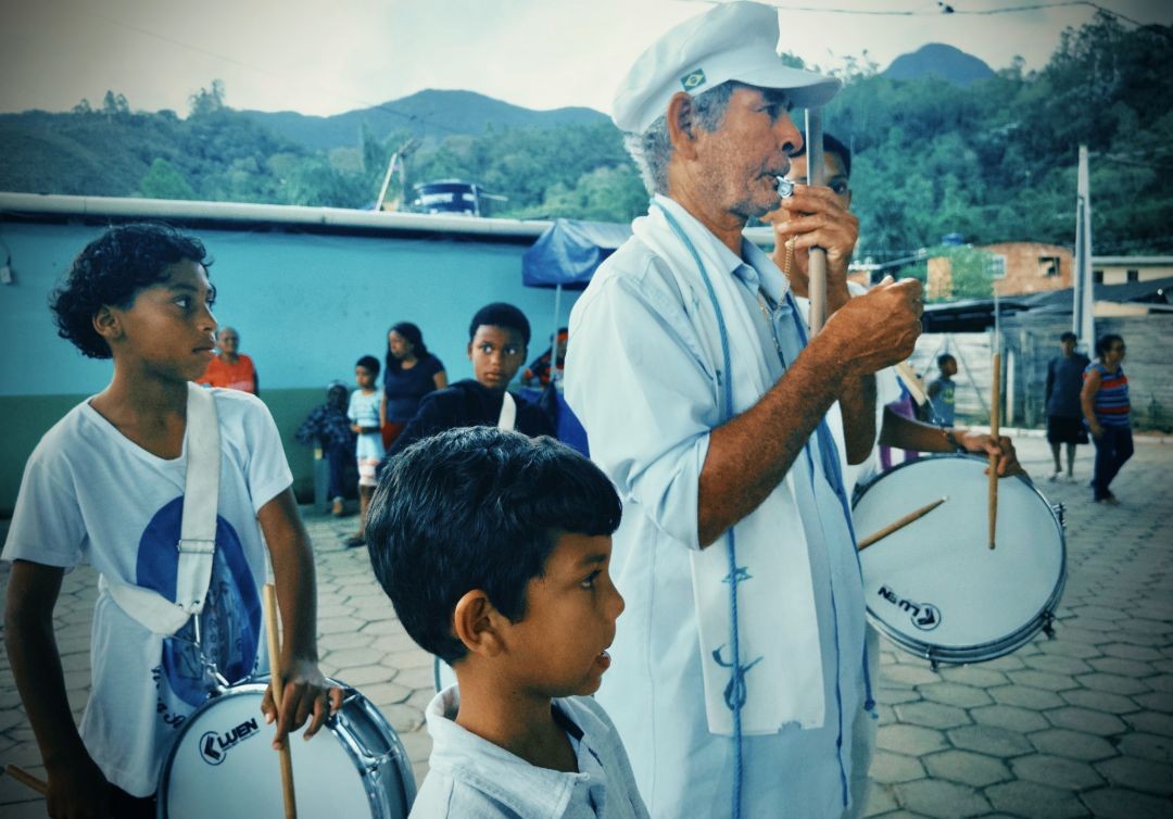 O grupo, formado por crianças e adultos, fez um cortejo pelas ruas da comunidade com muita dança e música. "A gente fica muito feliz, muito agradecido de poder estar mostrando um pouquinho do nosso trabalho para as pessoas e felizes com o interesse que as pessoas têm com a nossa cultura", afirma Elineia, integrante e filha de uma das fundadoras do grupo que existe desde 1999.