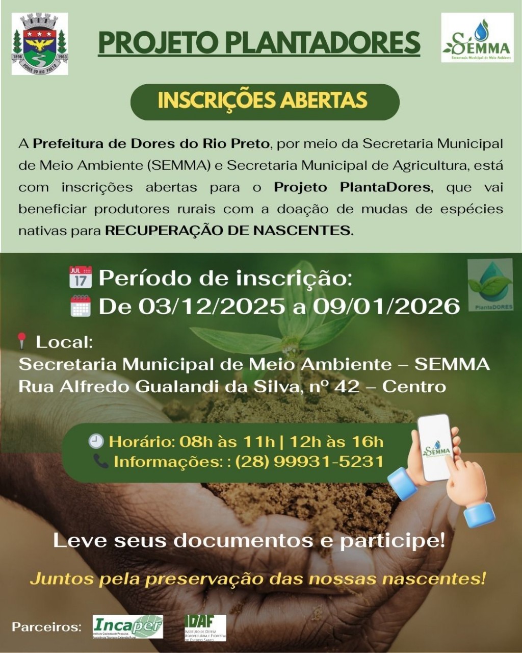 A Prefeitura Municipal de Dores do Rio Preto, por meio da Secretaria Municipal de Meio Ambiente (SEMMA) e Secretaria Municipal de Agricultura, vai beneficiar produtores rurais com a doação de mudas de espécies nativas para recuperação de nascentes.