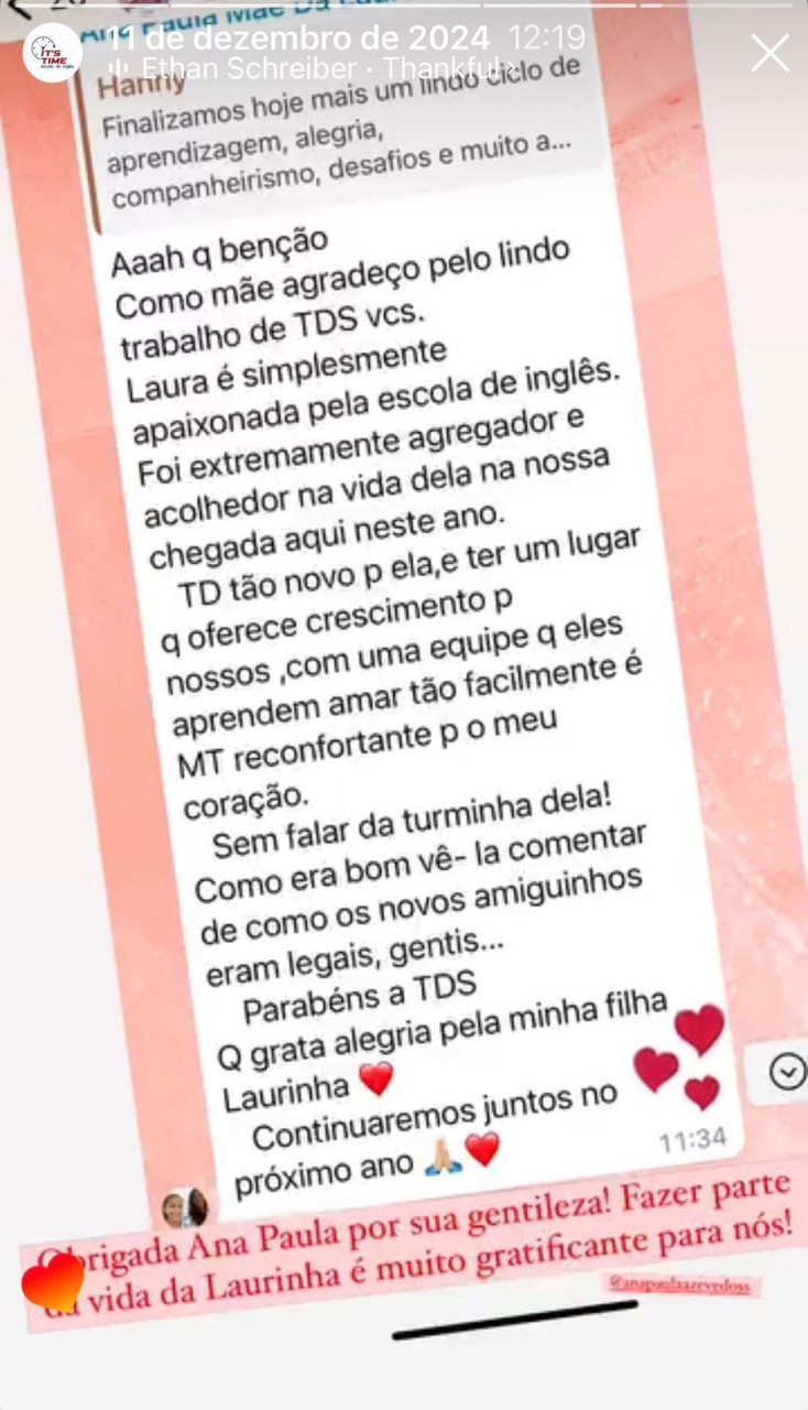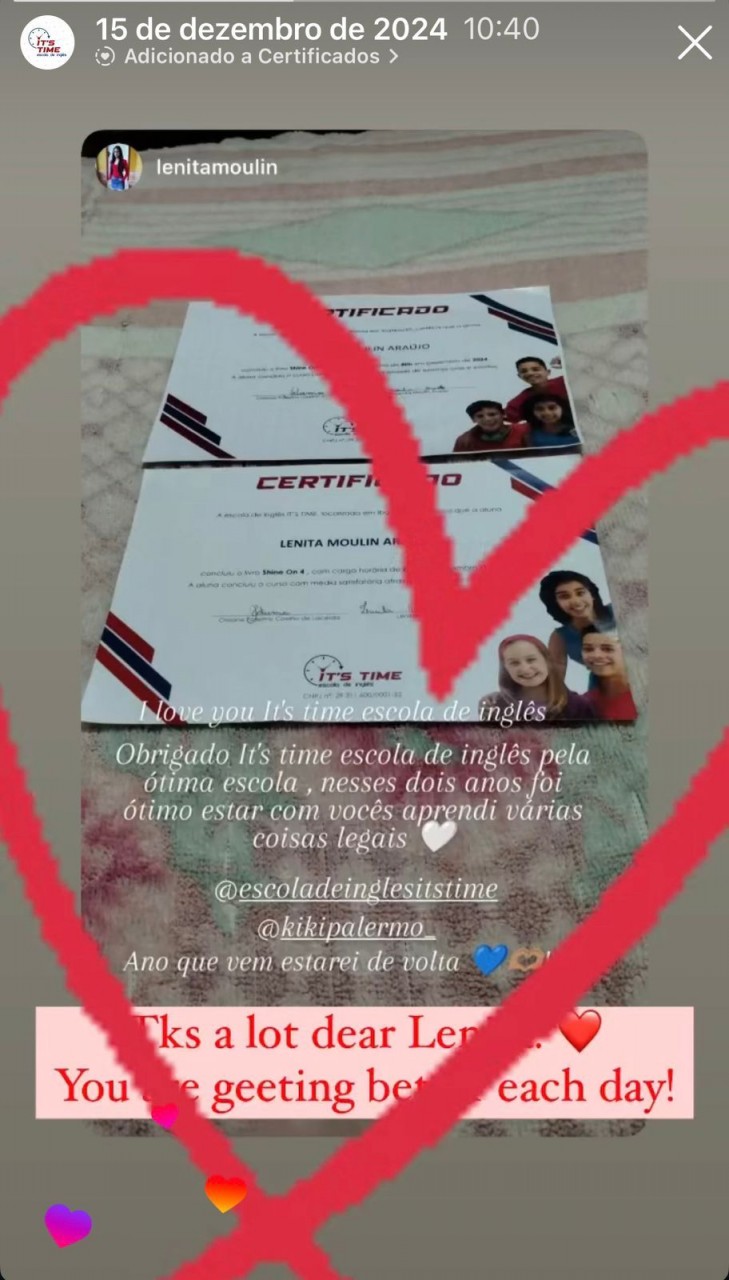 Com aulas envolventes e acompanhamento contínuo, a It's Time Escola de Inglês tem contribuído para que seus alunos alcancem avanços significativos, não apenas no domínio da língua inglesa, mas também em aspectos como autoconfiança, comunicação e visão de futuro.