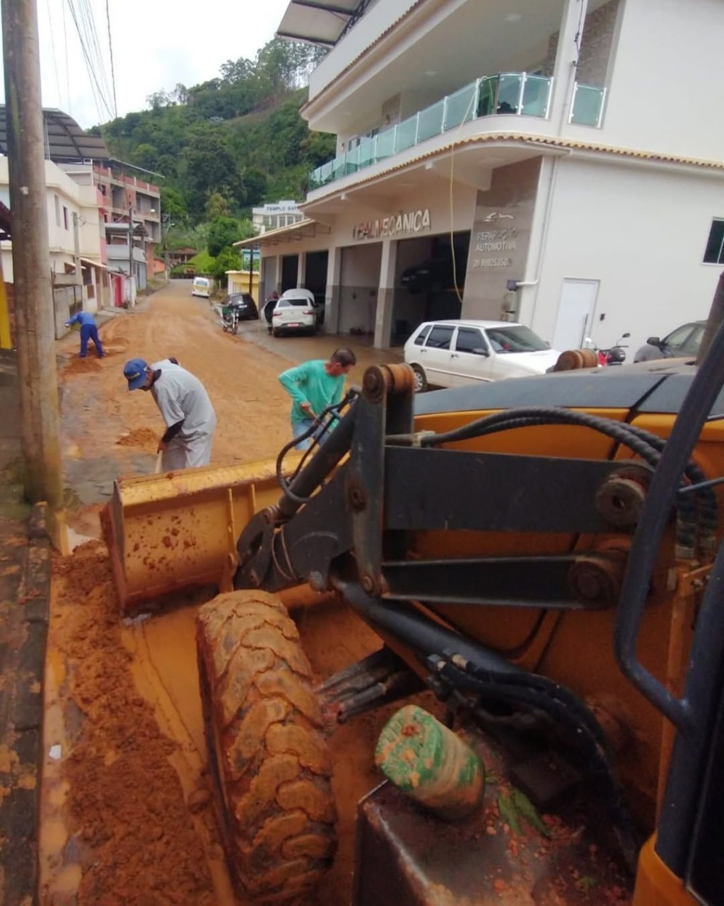 Equipes da Defesa Civil e da Secretaria de Obras atuam na remoção de lama e desobstrução de vias no distrito de Ibitirama; moradores podem acionar plantão pelo telefone (28) 99902-6787