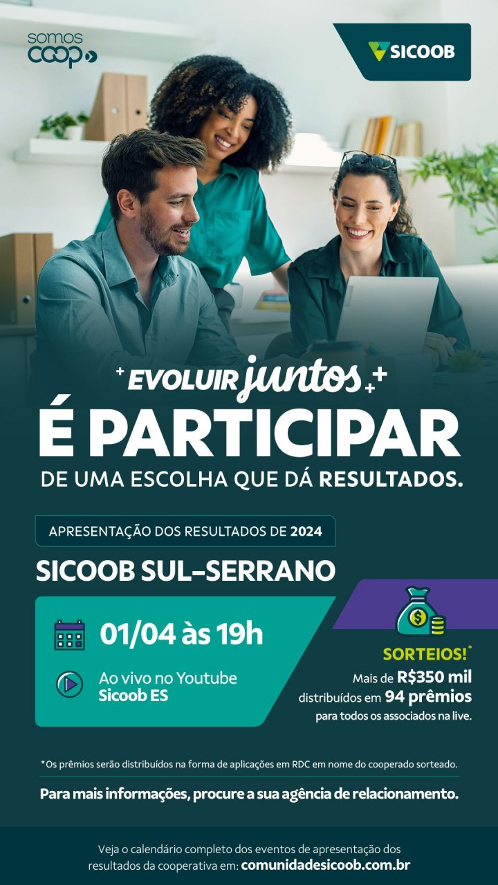No dia 01/04 o Sicoob apresentará ao vivo e on-line os resultados alcançados no ano de 2024. A transmissão ocorrerá ao vivo via Youtube, no canal do Sicoob ES.