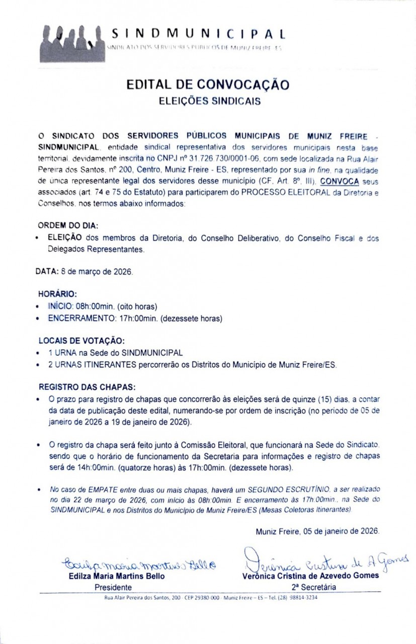 Edital de Convocação - Sindicato dos Servidores Públicos Municipais de Muniz Freire - Sindmunicipal