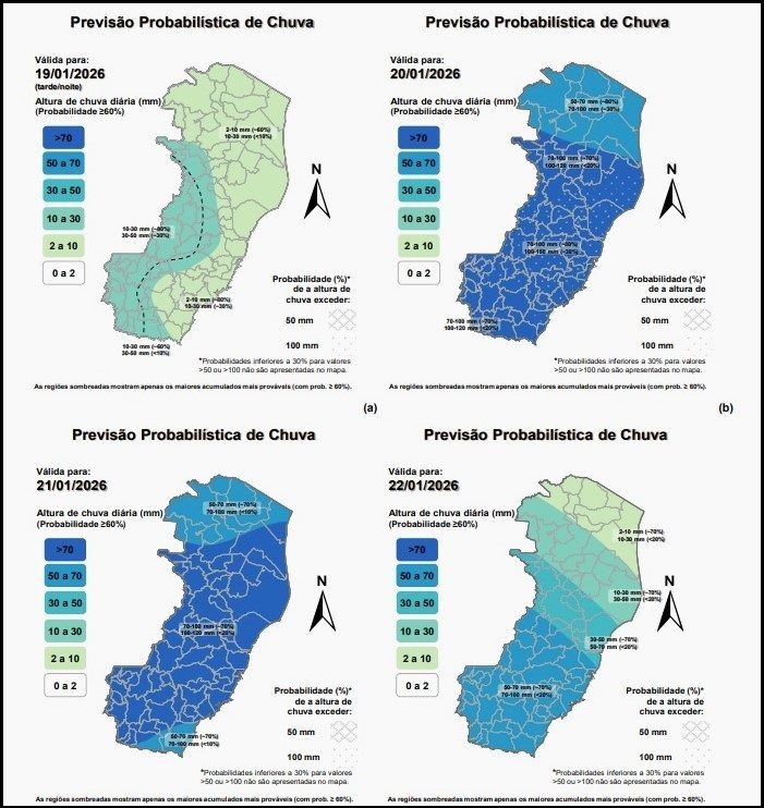 A terça-feira (20) deverá apresentar o cenário mais crítico do período, com risco elevado para alagamentos, enxurradas, inundações e deslizamentos. Há probabilidade de até 80% para acumulados acima de 70 mm em grande parte do estado, com chance de até 30% para volumes entre 100 e 150 mm. Aviso de impacto alto ativo, para todo o Espírito Santo, com possibilidade de incremento para impacto excepcional em áreas das regiões Sul – incluindo o Caparaó – e Oeste.