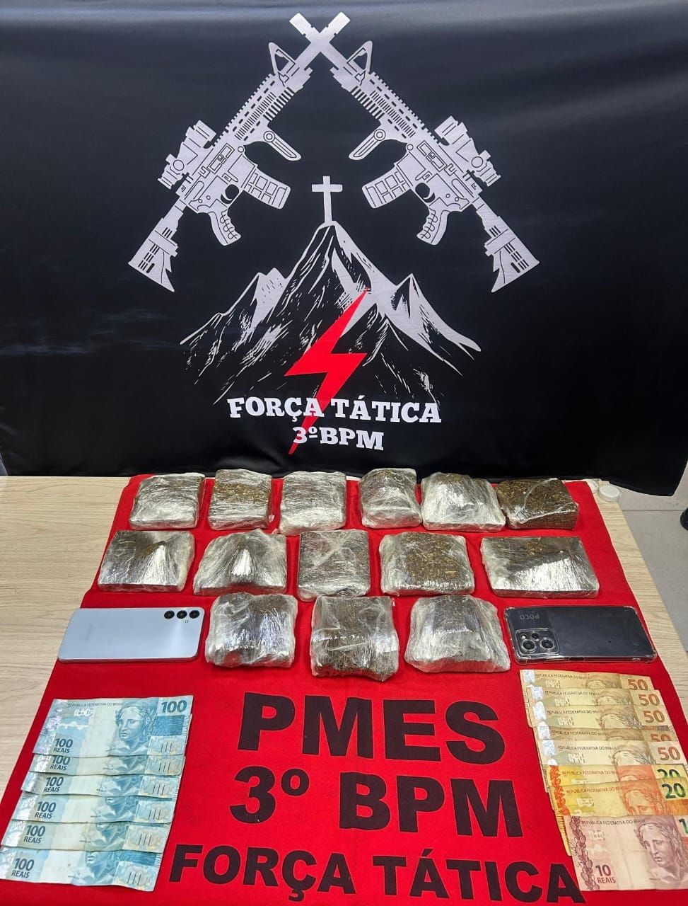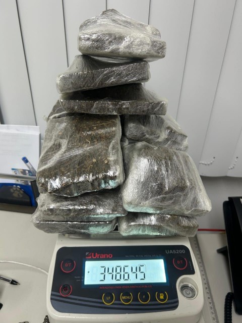 Durante a fiscalização, os militares localizaram sob o banco do passageiro, uma sacola contendo 14 tabletes de maconha, que totalizaram 3,486 quilos do entorpecente. Além da droga, também foram apreendidos R$ 900,00 em dinheiro e dois aparelhos celulares.