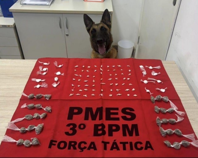 Segundo a PM, a ação teve apoio da Equipe K9 com a cadela farejadora Alga, que indicou uma sacola contendo 30 buchas de maconha, 17 papelotes de cocaína e 63 pedras de crack.