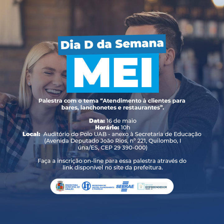 Acontece na próxima terça-feira, dia 16/05, na praça do Ginásio de Esportes, das 09h às 15h, um encontro para trabalhadores Microempreendedores (MEI). Podem participar quem deseja ser MEI ou aqueles que já são e queiram melhorar seu negócio no dia a dia.