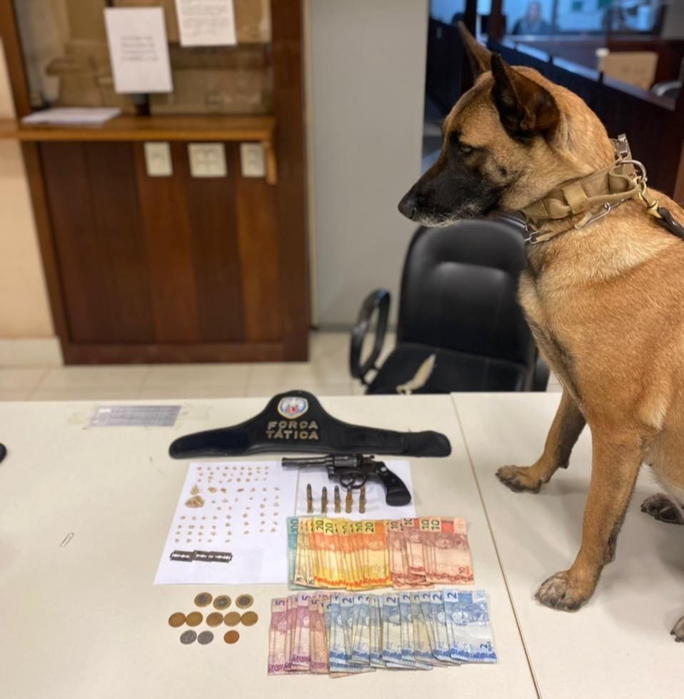 A operação contou com o apoio da patrulha K9, com a cadela farejadora. Ao todo, foram apreendidos 73 pedras de crack, uma pedra maior de crack, três giletes, um revólver taurus raspado, 10 munições e R$ 617,75 em dinheiro.